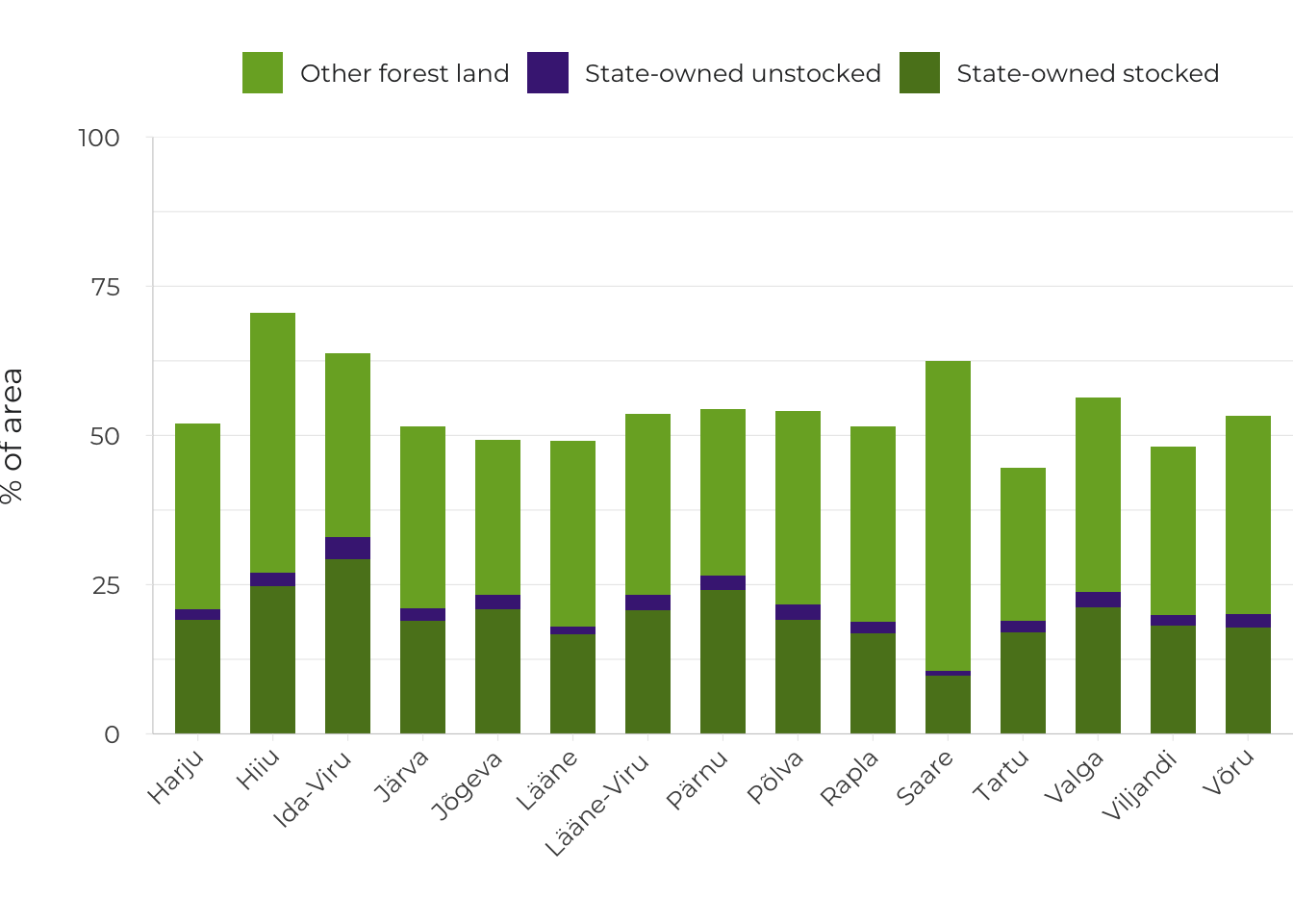 2. The milieu value of state forest is decreasing due to felling. After a relatively stable period between 1995 and 2008, clear-felling has increased in all forests, including by more 50% in state forests, where more than 10,000 hectares have been felled annually since 2015 (Raudsaar et al. 2018). The fact that felling reduces human-environment value is demonstrated by people’s aesthetic aversion to clear-felled areas and the traces left behind by felling (Gundersen and Frivold 2008; Kõivik 2014) as well as the practical consequences, such as the loss of forests suitable for berry or mushroom picking. These preferences were confirmed by a recent environmental awareness survey (Turu-uuringute AS 2018), which showed that forest degradation was considered the most important environmental issue in 2018 and the reliability of the State Forest Management Centre (RMK) had dropped significantly compared to 2016. Increased local protests against logging show people’s willingness to shape their living environment, at least on state land. In terms of opportunities for spending time in forest areas, the counties of Saaremaa and Läänemaa stand out for having the smallest amount of state forests and potentially the greatest impact from restrictions set by private owners (Figure 3.0.2). On the other hand, relatively little felling has been done in the state forests in Saaremaa and Läänemaa (about 7% of the state forest area was unstocked forest land as of 2017), especially compared to the counties of southeastern Estonia and Ida-Virumaa county (over 12%).