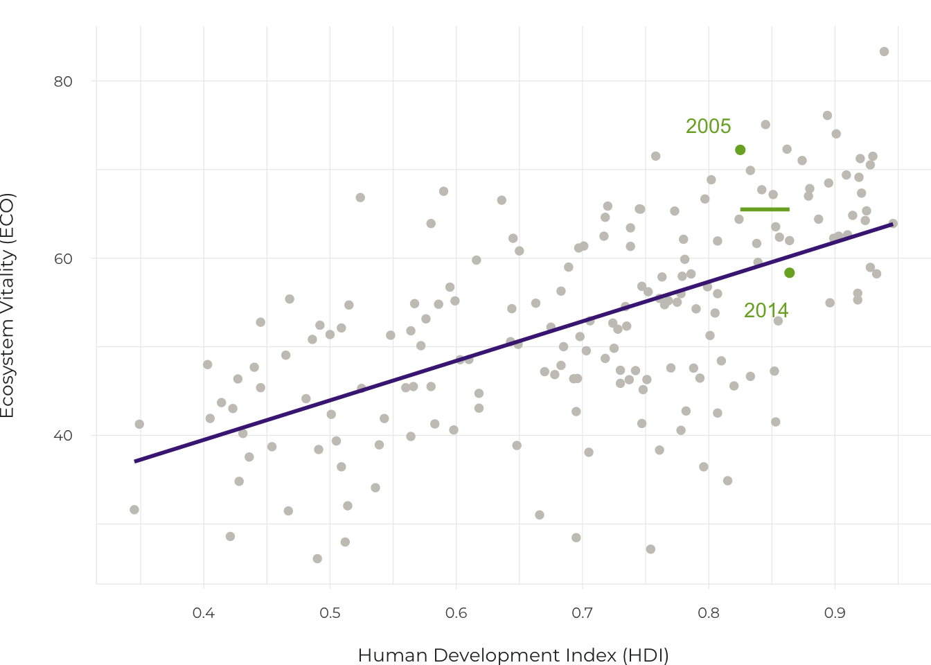 Note: The correlation is based on data from the UN Development Programme for the human development index (HDI) and data from Wendling et al. (2018) for ecosystem vitality (ECO). In the case of ECO, the average start year (2005; source data 2001–2007) and end year (2014; source data 2010–2017) have been calculated as the weighted mean of the components of the index; the HDI (2014) has been correlated with the end year. The line indicates the ECO level in the Estonian Human Development Report 2014/2015 (Terasmaa and Pajula 2015); the level has not been adjusted retrospectively and the year for which this level is valid was unspecified.
